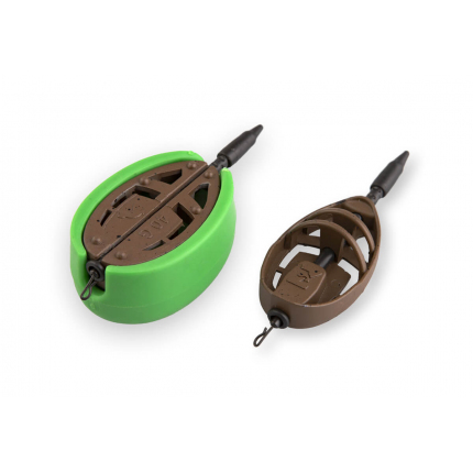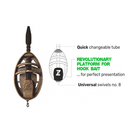 Na vývoji těchto sofistikovaných krmítek se podílel team našich specialistů a jsou skutečně promyšlená do posledního detailu. Krmítka mají ideální velikost a jsou dokonale vyvážená, takže se s nimi dobře nahazuje a ke dnu dosednou vždy tou správnou stranou. Revoluční novinkou u těchto krmítek je speciální můstek/ploška k umístění nástrahy s háčkem, což zaručí, že Vaše nástraha bude vždy přesně tam, kde má být. Velkou výhodou krmítka je možnost snadné a rychlé výměny zátěže. Umožňuje to vyjímatelná trubička a průřez na zadní straně krmítka. Po vysunutí trubičky z těla krmítka stačí vyjmout vlasec a vyměnit zátěž za jinou. Taková variabilita vám poskytne možnost přizpůsobení se různým podmínkám během lovu, bez nutnosti zdlouhavého převazování koncové sestavy. Krmítka jsou zhotovena v matně hnědé barvě s černými tečkami, takže snadno splynou se dnem a ryby v okolí krmného místa nebudou tolik vyrušovat. Součástí je samozřejmě i univerzální QC obratlík vel. 8 pro snadnou výměnu koncového návazce.