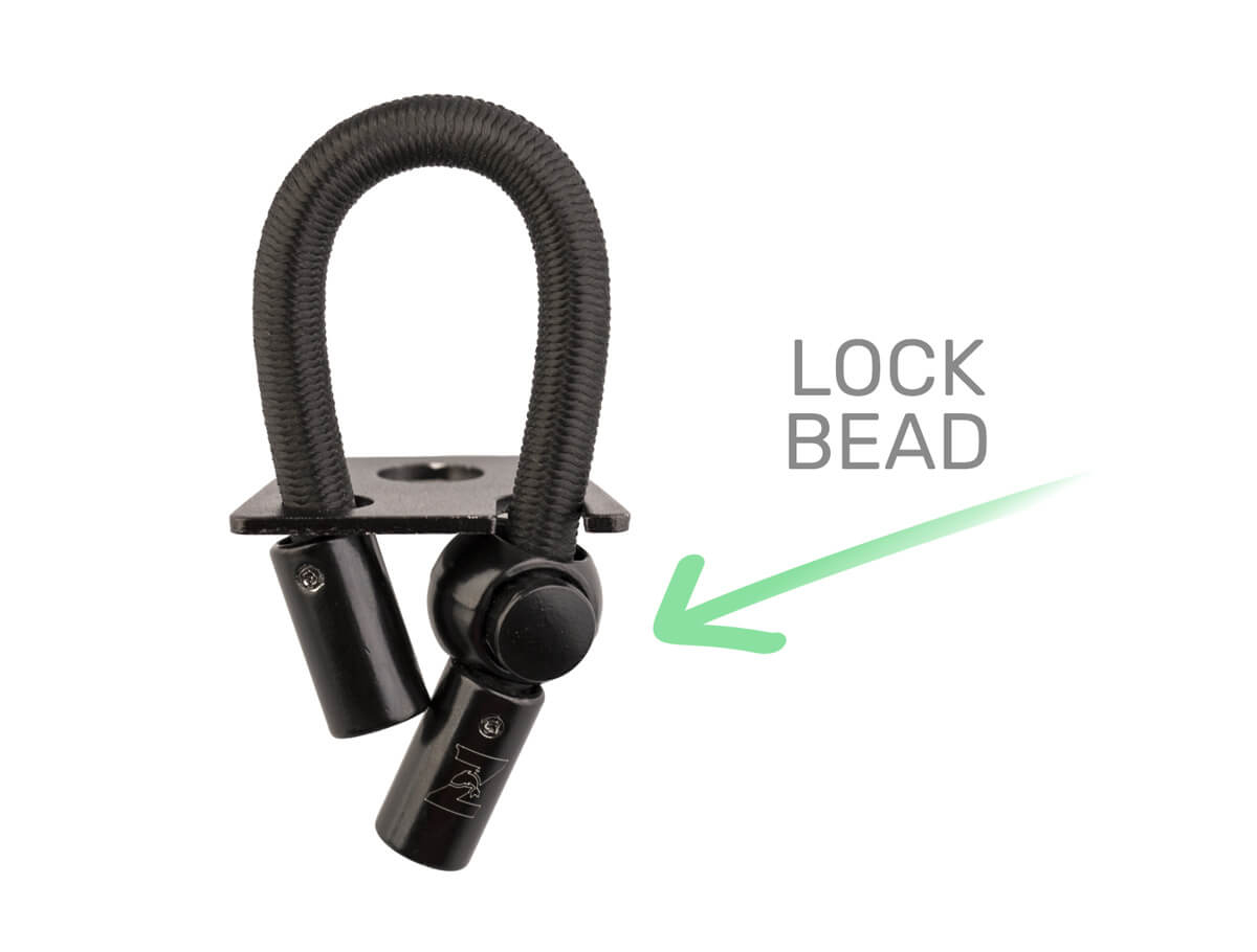 Pojistka se jednoduše namontuje pod jakoukoli běžnou rohatinku a snadno se přizpůsobí průměru vašich prutů díky nastavitelné délce fixační gumy. Bezpečné zajištění prutu obstará posuvný kovový korálek.
