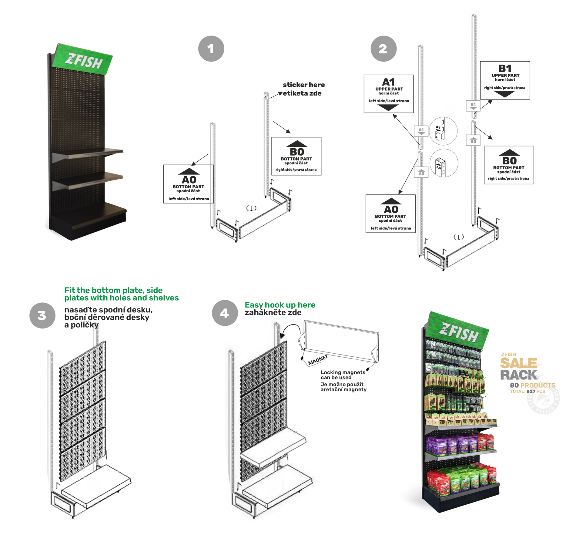 Celý popisZFISH Stojan Sales Rack je pevný a stabilní prodejní regál, který je ideálním pomocníkem pro naprosto dokonalou prezentaci našich nových vymazlených produktů prémiové řady "3FISH". Nekompromisní kvalita materiálu a zpracování těchto stojanů spolu s elegantním černo-zeleným ZFISH designem zajistí, že se na Vaší prodejně rozhodně neztratí a jsme si jistí, že neunikne pozornosti žádného zákazníka. Regál disponuje velkou děrovanou plochou k zavěšení produktů na klasické prodejní háčky, a je dále opatřen dvěmi libovolně umístitelnými policemi a i samotná podstava tvoří polici a umožňuje vystavit další produkty. Součástí balení těchto ZFISH regálu jsou samozřejmě i samotné závěsné háčky a to v počtu 70 ks. ( 50 kratších s délkou 10cm a 20 kusů o délce 20cm ). Stojany jsou ssamozřejmě navržené a vyrobené tak, aby šli snadno propojit a seskládat vedle sebe.