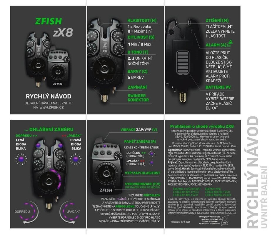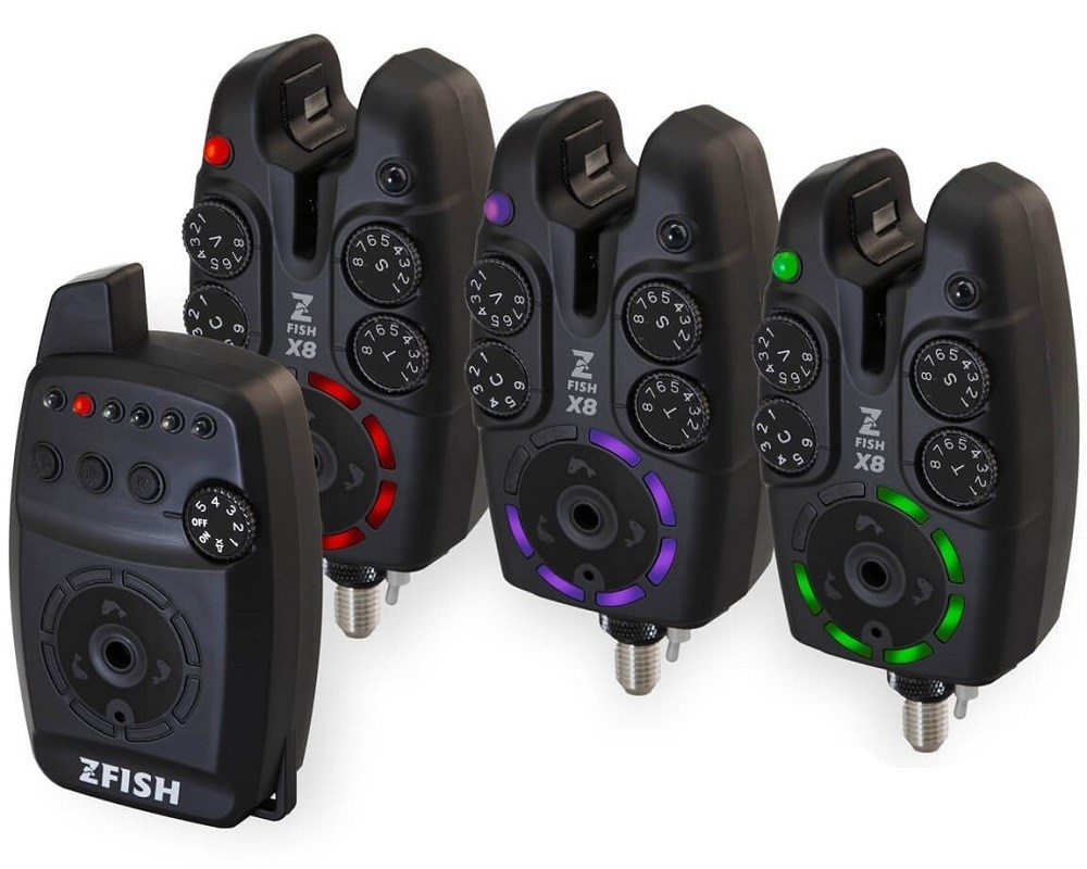 Při vývoji a navrhování těchto hlásičů jsme kladli důraz na odstranění všech běžných nešvarů a můžete si být jistí, že tyto hlásiče jsou skutečně “vymazlené” do posledního detailu, zkrátka hlásiče nové generace. Zx8 disponují 6-ti barvami a dokonce 8-mi zvukovými tóny (z nichž 2 jsou zcela unikátní hluboké tóny speciálně navržené pro noční rybolov) a navíc jsou opatřeny alarmem proti krádeži. Další užitečnou funkcí je paměť záběrů, která vám umožní zjistit zda jste měli “jízdu” (záběr vpřed), nebo takzvaný “padák” (zpětný záběr směrem k vám). Samozřejmostí jsou vibrace příposlechu a snadné nastavení celkové citlivosti a hlasitosti. Zx8 byly testovány v extrémních podmínkách, takže za jejich odolnost proti vodě a prachu, můžeme dát ruku do ohně a navíc bezproblémů fungují až na vzdálenost 200m.